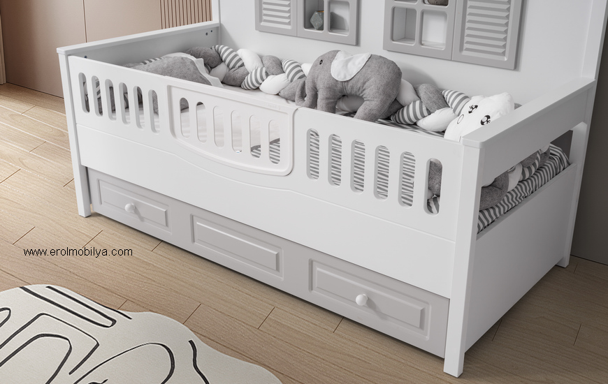 Ürüne Ait Parça Adetleri : 4 Kapılı Gardırop, Şifonyer, Mia Yavrulu Karyola, Korkuluk Aparatı Bu Üründe Üst Yatak Ölçüsü : 90 cm * 190 cm (Yaylı Yatak Fiyata Dahil Değildir) Yavru Yatak Ölçüsü : 80 cm * 180 cm (Yaylı Yatak Fiyata Dahil Değildir) Yatak ve Uyku Seti Fiyata Dahil DEĞİLDİR ÜRÜN RENGİ : BEYAZ - GRİ