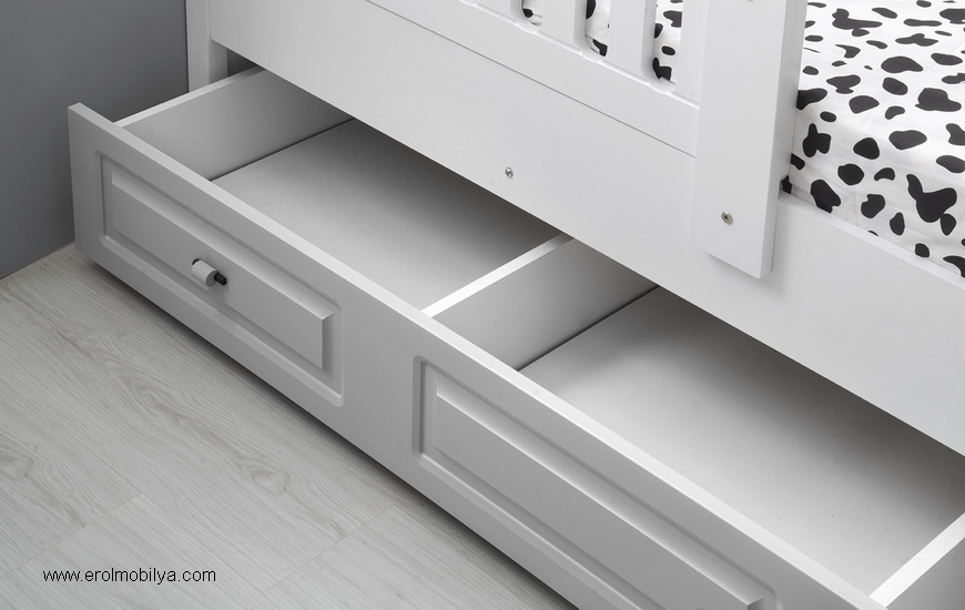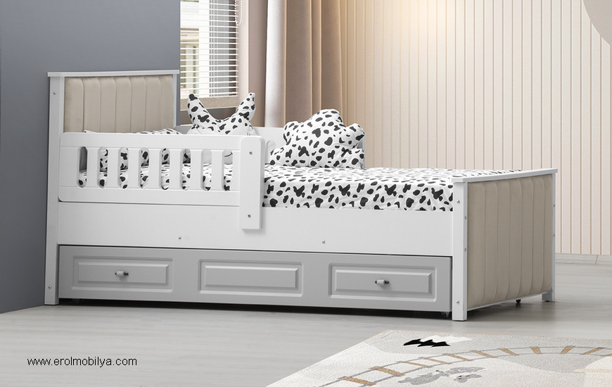 Ürüne Ait Parça Adetleri : Yavrulu Karyola Karyola Yatak Ölçüsü : 90 cm * 190 cm (Yaylı Yatak Fiyata Dahil Değildir) Yavru Yatak Ölçüsü : 80 cm * 180 cm (Yaylı Yatak Fiyata Dahil Değildir) ÜRÜN RENGİ : BEYAZ - GRİ (BAŞLIK KUMAŞ RENGİ KREM)